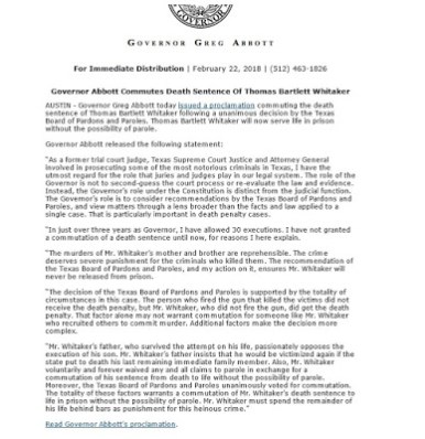 Texas governor commutes death penalty on advice from clemency board: https://deathpenaltynews.blogspot.com.au/2018/02/texas-governor-abbot-commutes-death.html?spref=tw