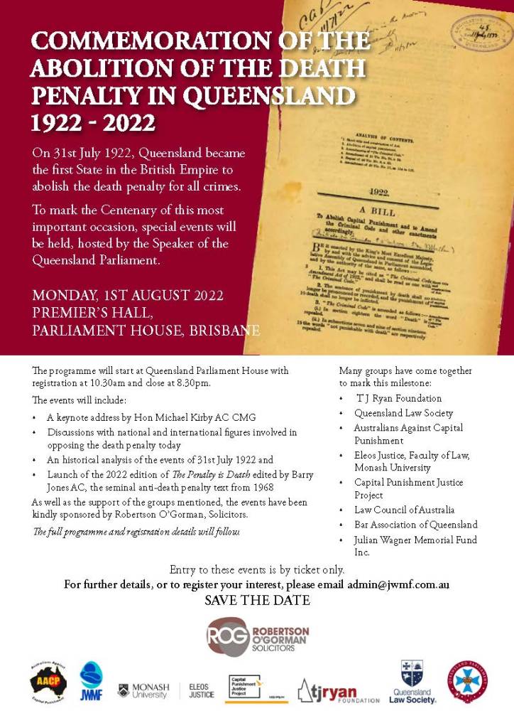 Upcoming Event: Commemoration of the Abolition of the Death Penalty in Queensland 1922 – 2022 May 27, 2022 gcsmorgan Uncategorized Leave a comment Please join us on 1 August 2022 at Parliament House for this important event commemorating the Abolition of the Death Penalty in Queensland. If you are interested in this event, please contact us at admin@jwmf.com.au for further information. Share this: Click to share on Facebook (Opens in new window) Facebook Click to share on X (Opens in new window) X Click to share on LinkedIn (Opens in new window) LinkedIn Click to share on WhatsApp (Opens in new window) WhatsApp Click to email a link to a friend (Opens in new window) Email Like Loading... Related